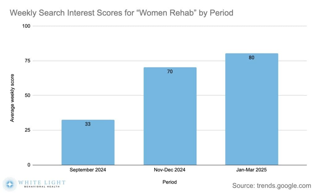 - National interest in “women rehab” peaked in early March 2025, hitting the highest level in 12 months.