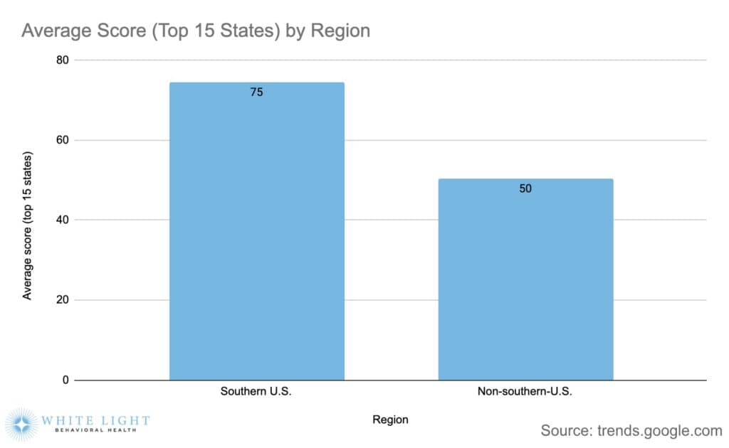 - Search activity increased in the South and Southeast, suggesting a regional addiction concern.
